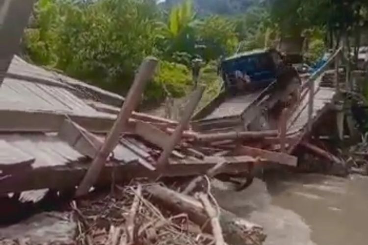 AMBRUK: Jembatan kayu yang menghubungkan 3 Desa di Kabupaten Kolaka Timur ambruk diterjang banjir.